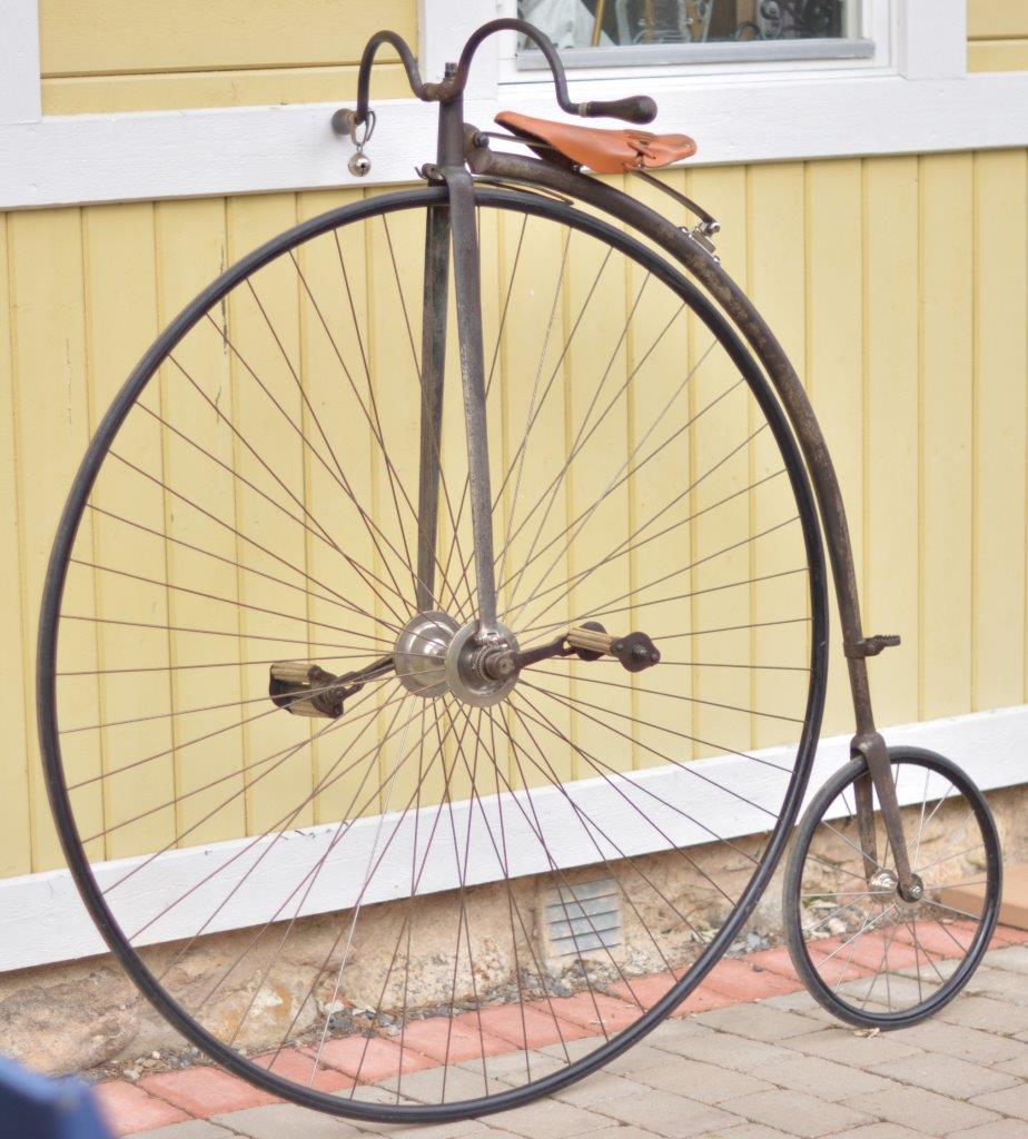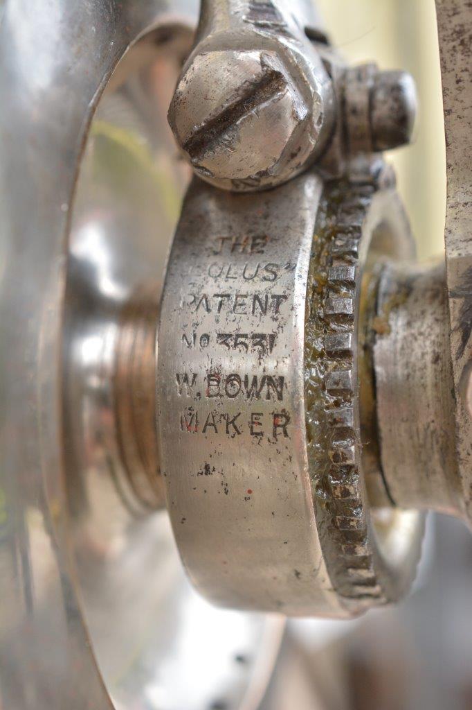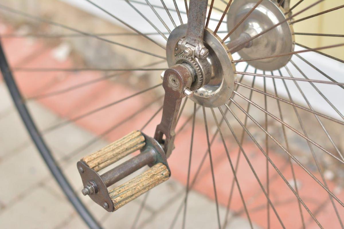 The 48 inch bicycle has the almost standard Bown Aeolus ball bearings and cranks carrying the name Carrington - seen before on assembled bicycles. You see some non-original parts: it was in a bad condition when the current owner bought it.